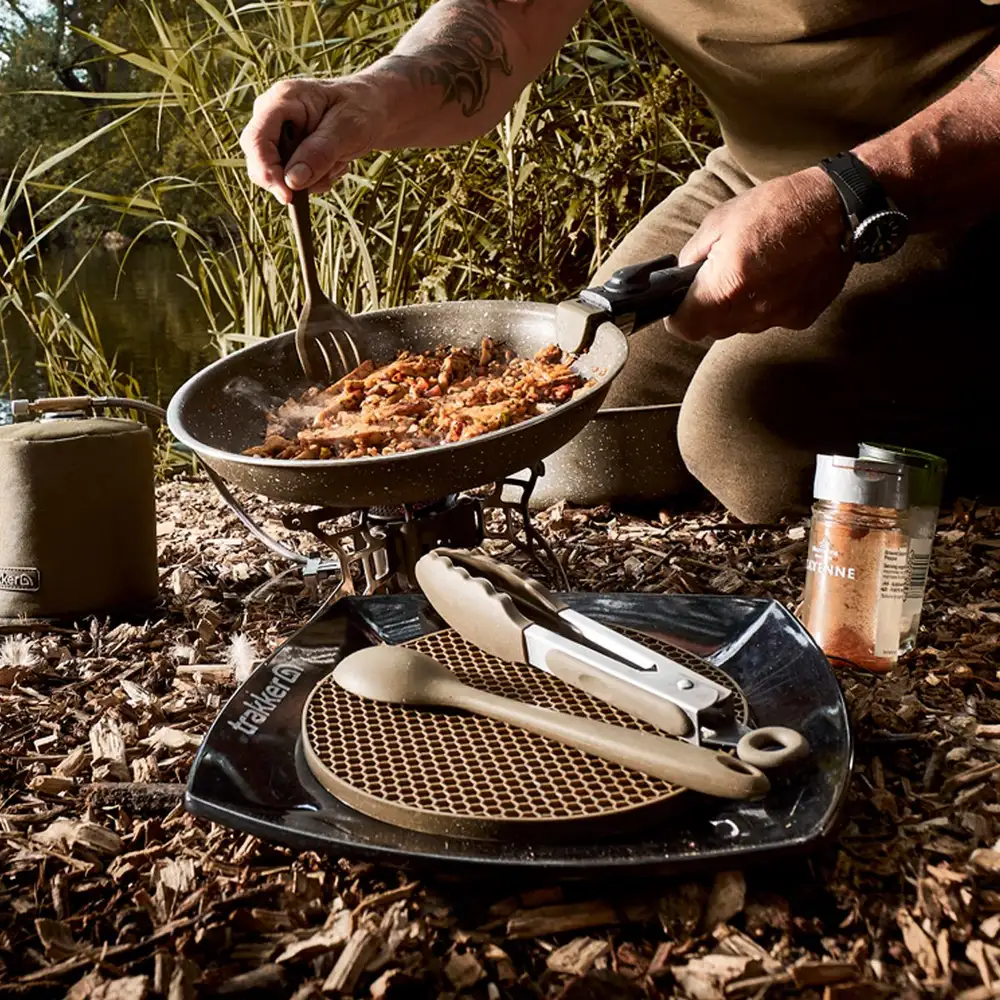 Kochen, essen, trinken und warm bleiben. Ein äußerst praktisches Sortiment (mit Töpfen, Pfannen und Herd von Trakker) für alle Mahlzeiten geeignet.